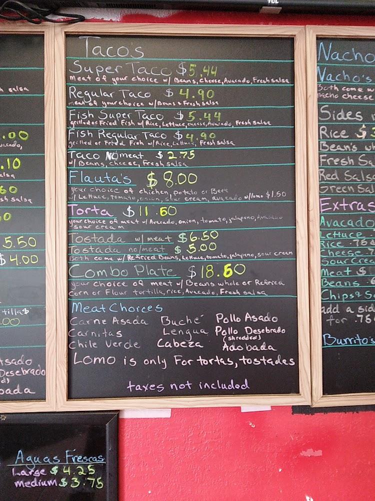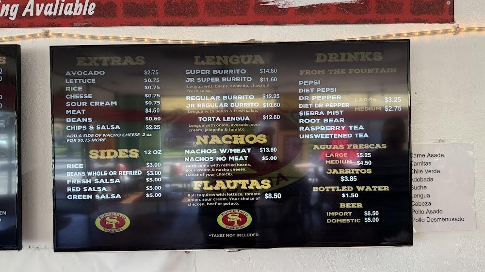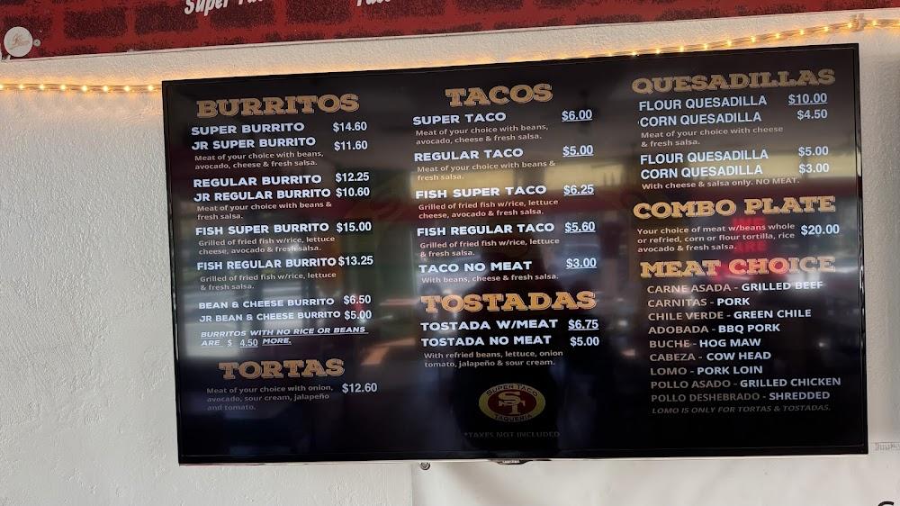 Super Taco's menu showcases classic Mexican dishes. The burritos are a standout, featuring super options loaded with tender meat and vibrant toppings. Tacos offer a range from regular to fish for seafood lovers.